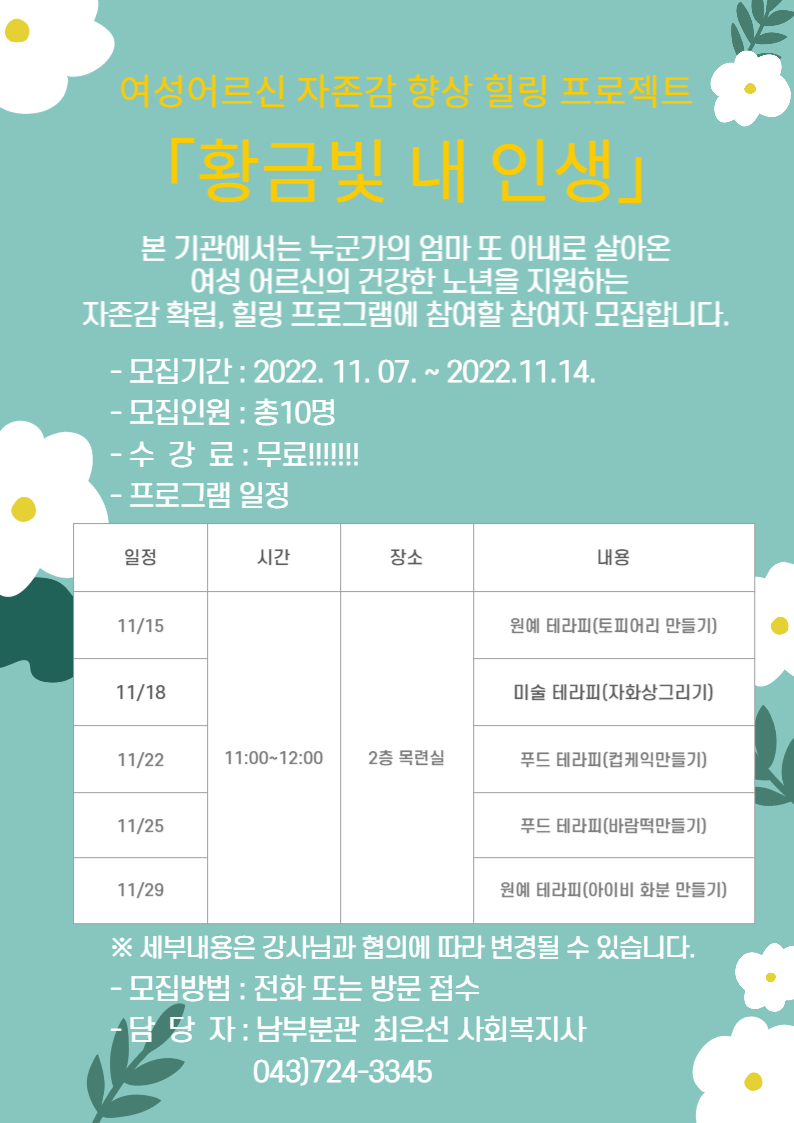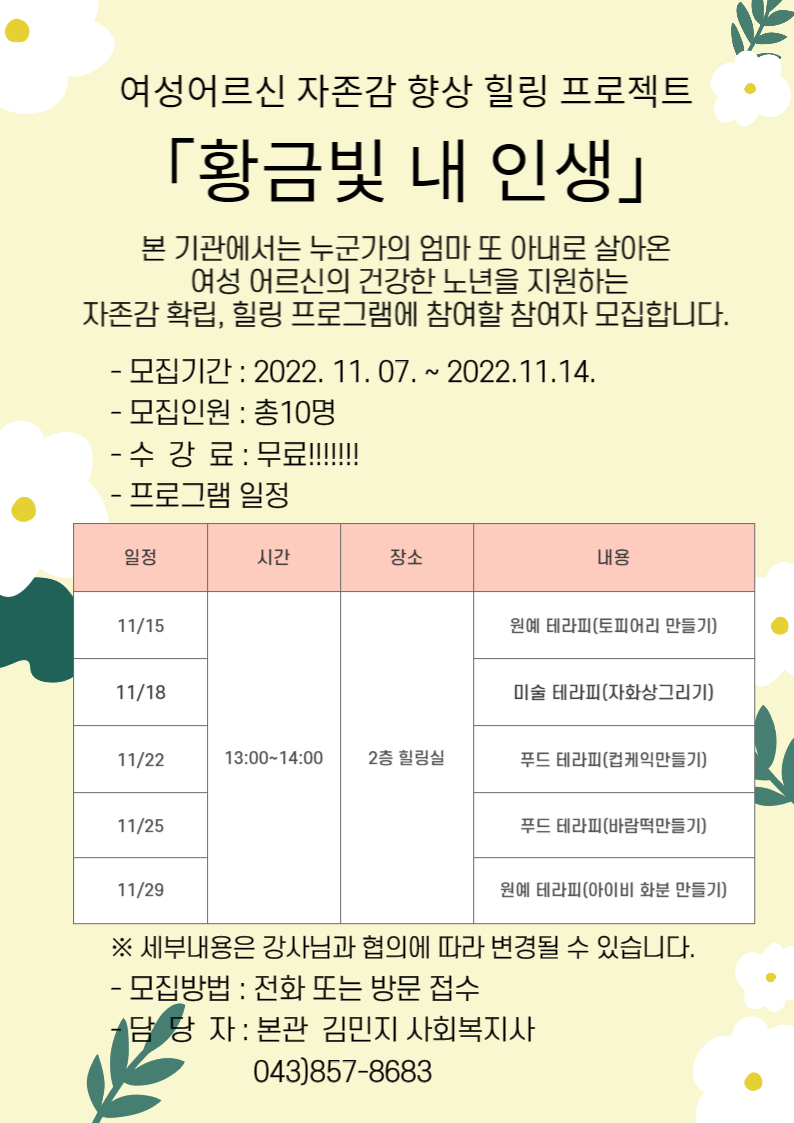 2022년 여성 어르신 자존감 향상 프로그램 「황금빛 내 인생」 참여자 모집
