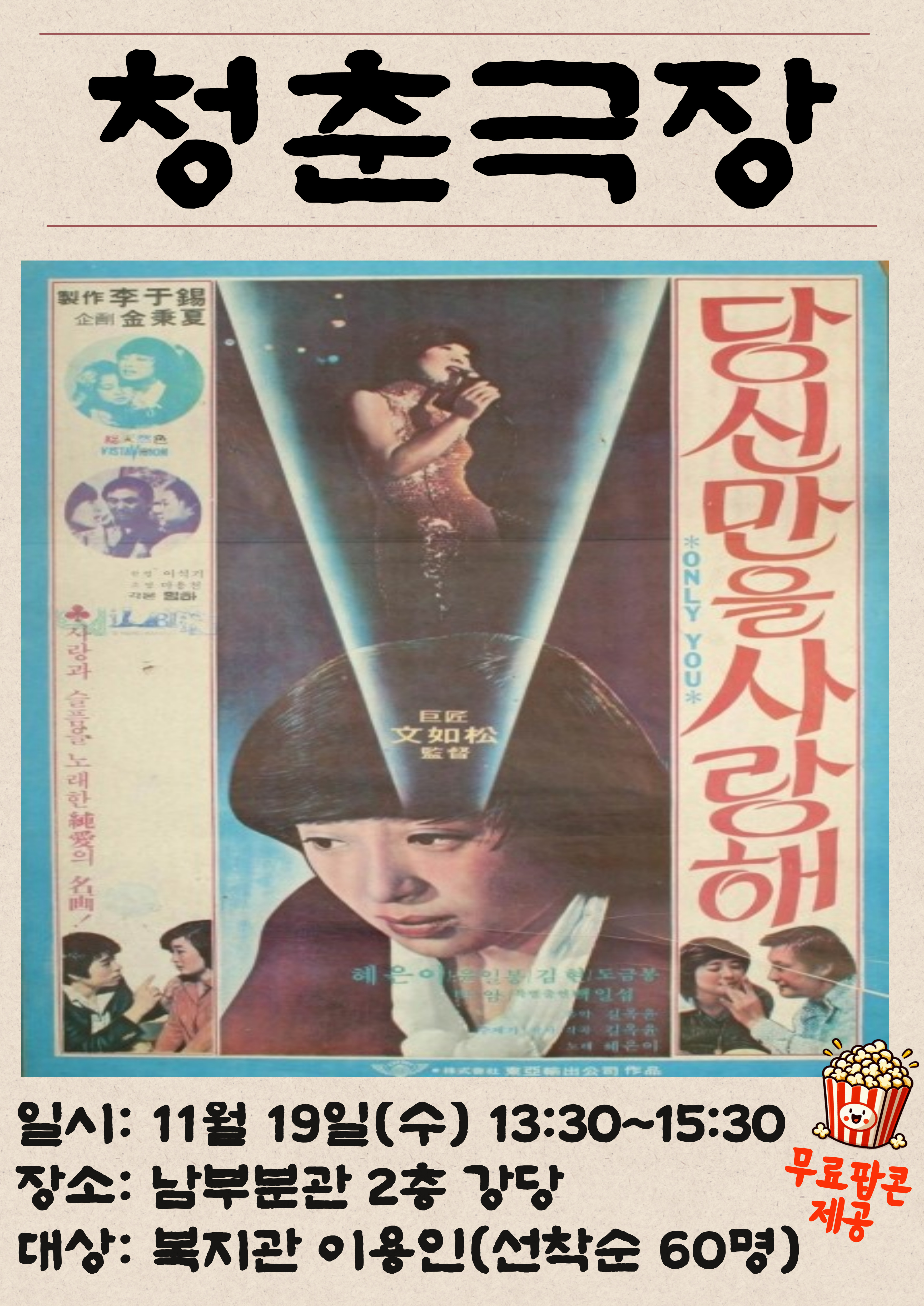 청춘극장에서는 11월19일 '당신만을 사랑해'를 상영합니다.