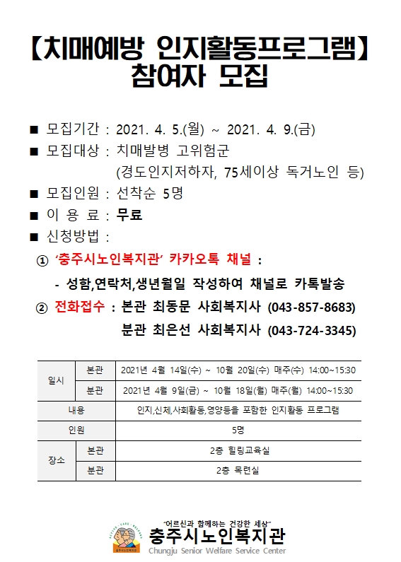 치매예방 인지활동프로그램 참여자 모집 공고