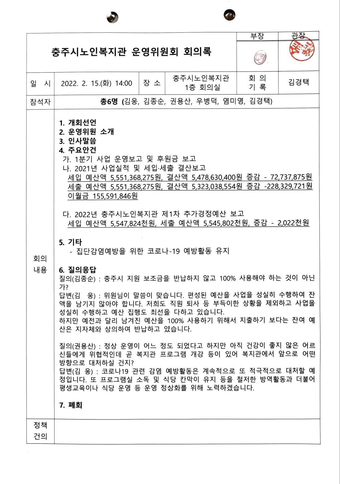 첨부. 충주시노인복지관 운영위원회 회의록 1부. 끝.