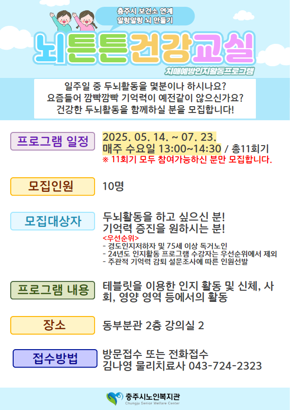 동부분관에서 뇌 튼튼 건강 교실에 참여할 어르신을 모집합니다~