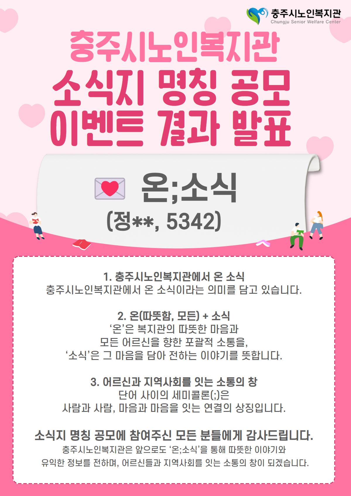 충주시노인복지관 소식지 명칭 공모 이벤트 결과를 다음과 같이 발표합니다.