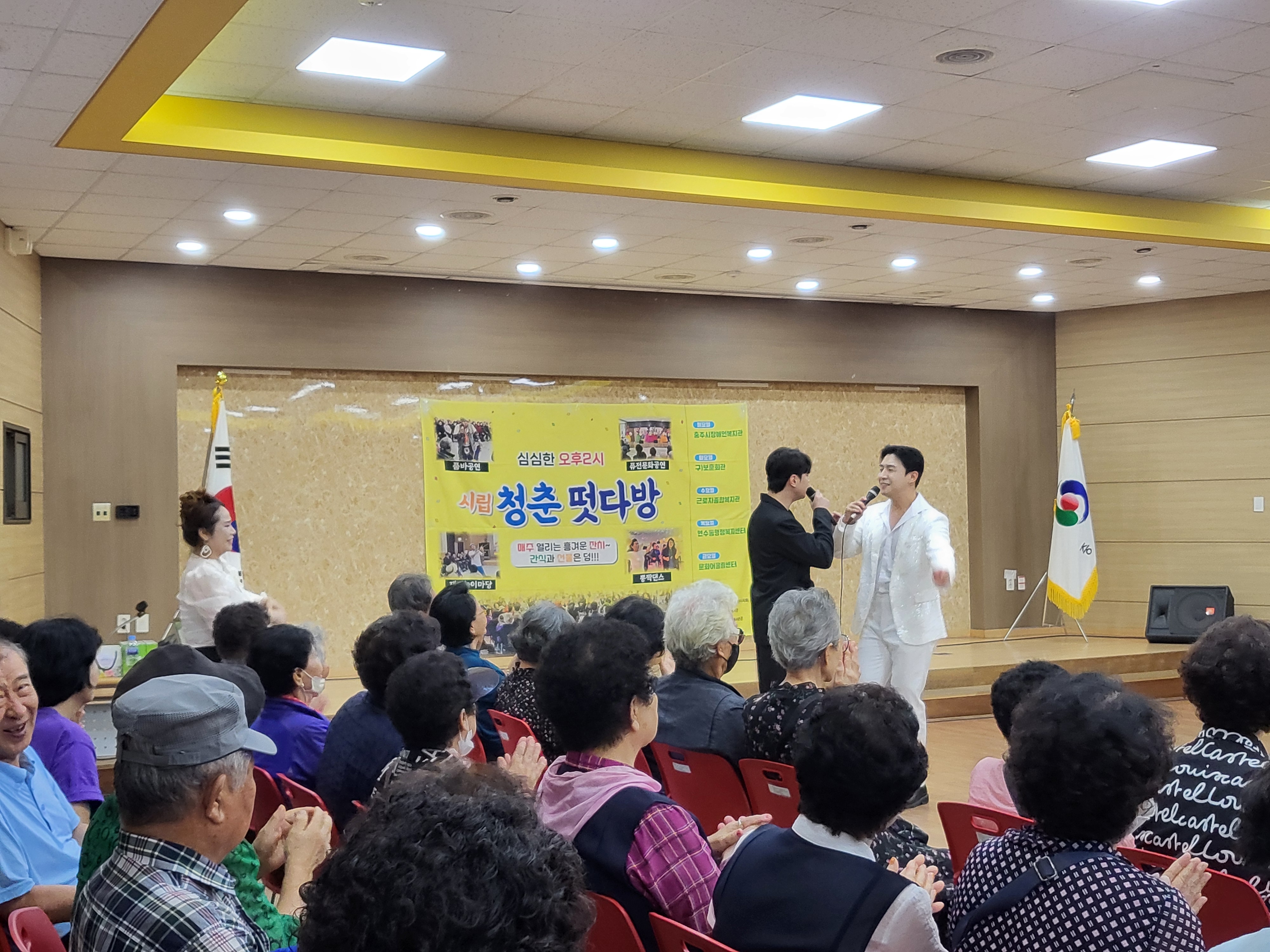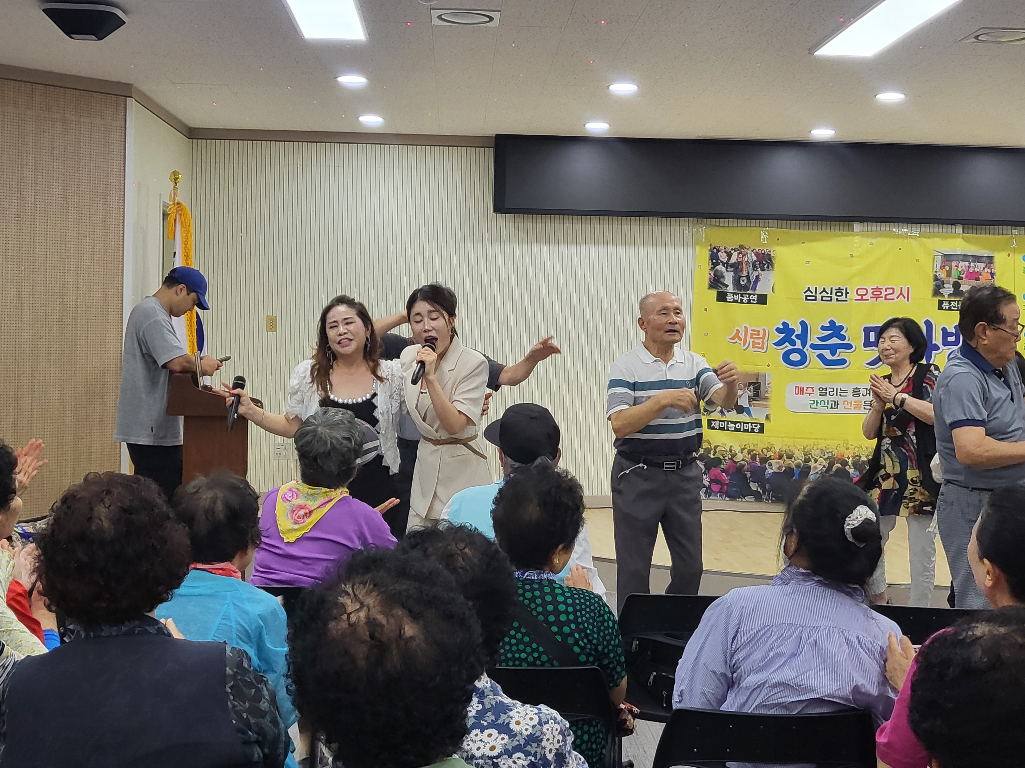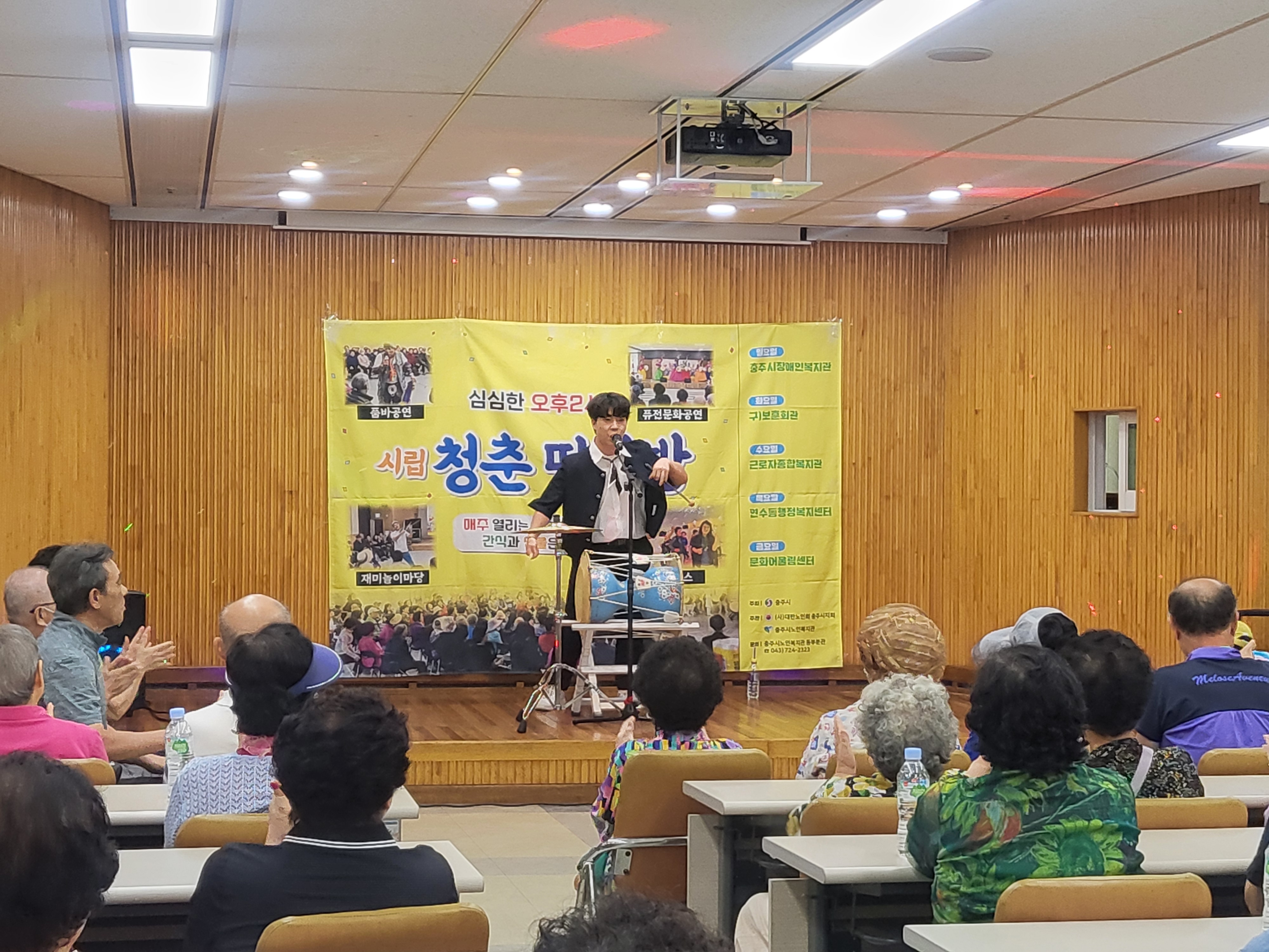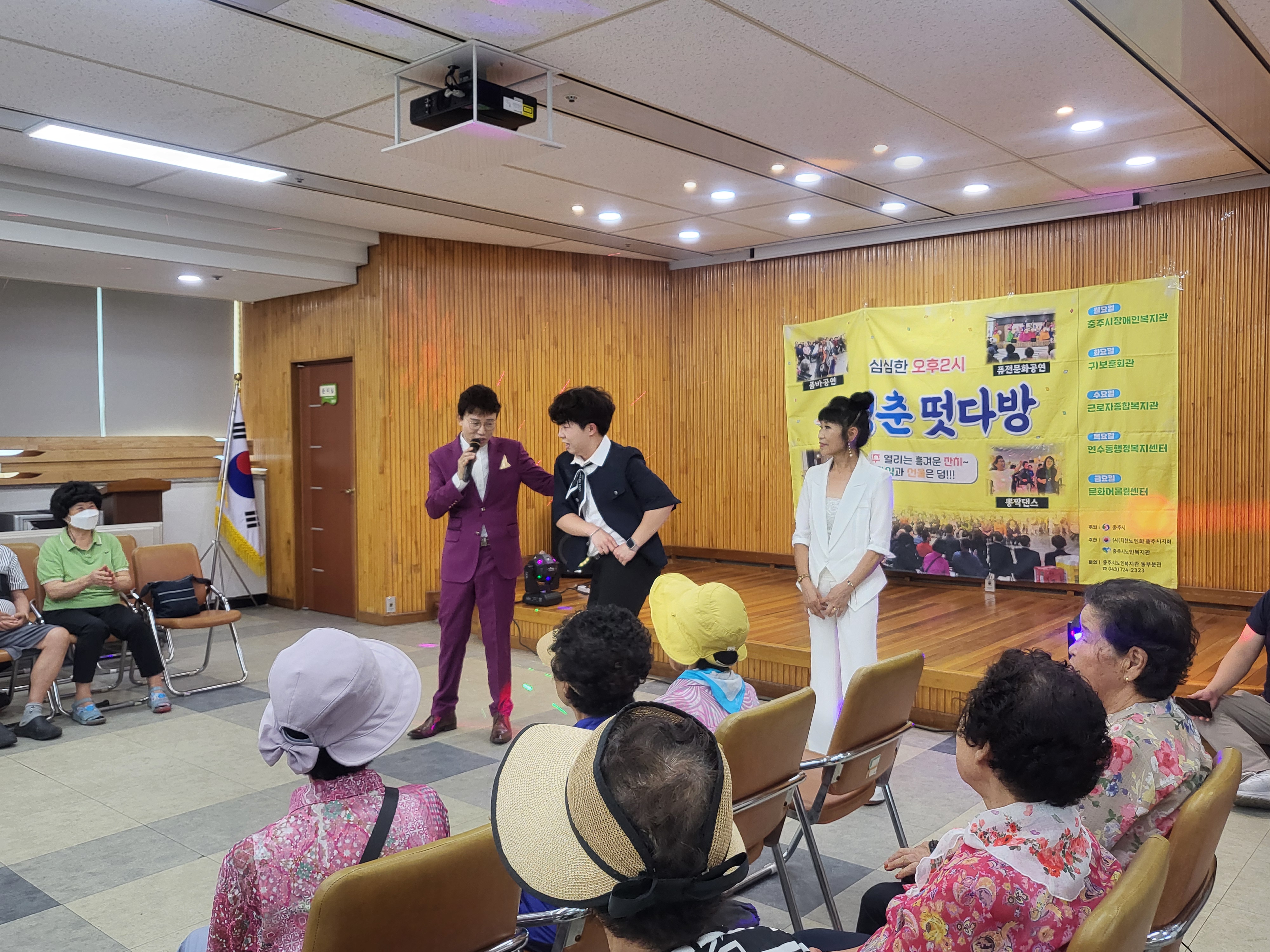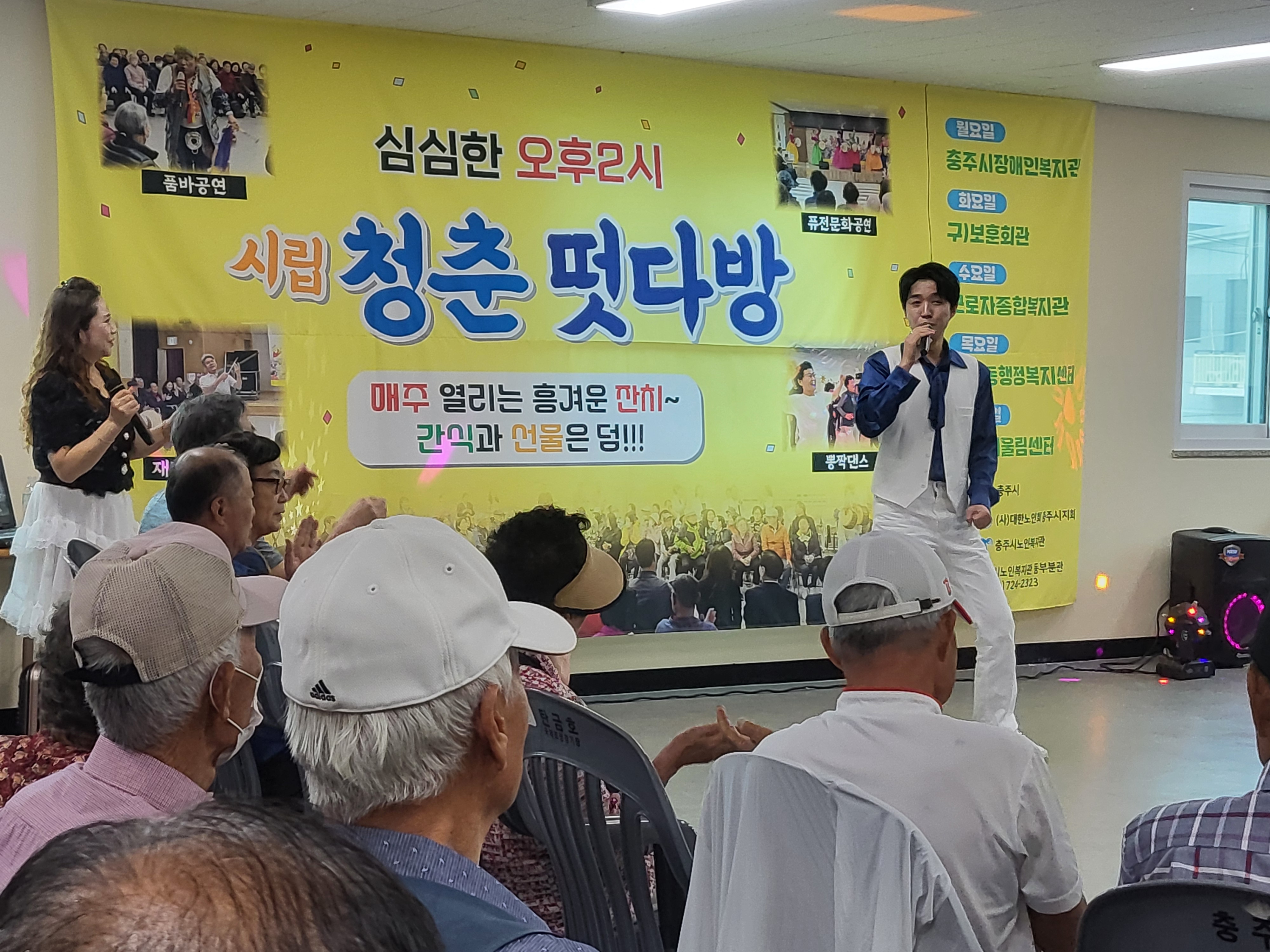 시립청춘떳다방은 9월 3주간동안 충주 시내 5개 거점 시설에서 매일 오후 2시 다양한 공연을 진행하여 어르신들께 즐거움과 웃음을 선사하였습니다. 9월 3주간 동안 총15회 공연과 1400 여명의 어르신들이 모였습니다.