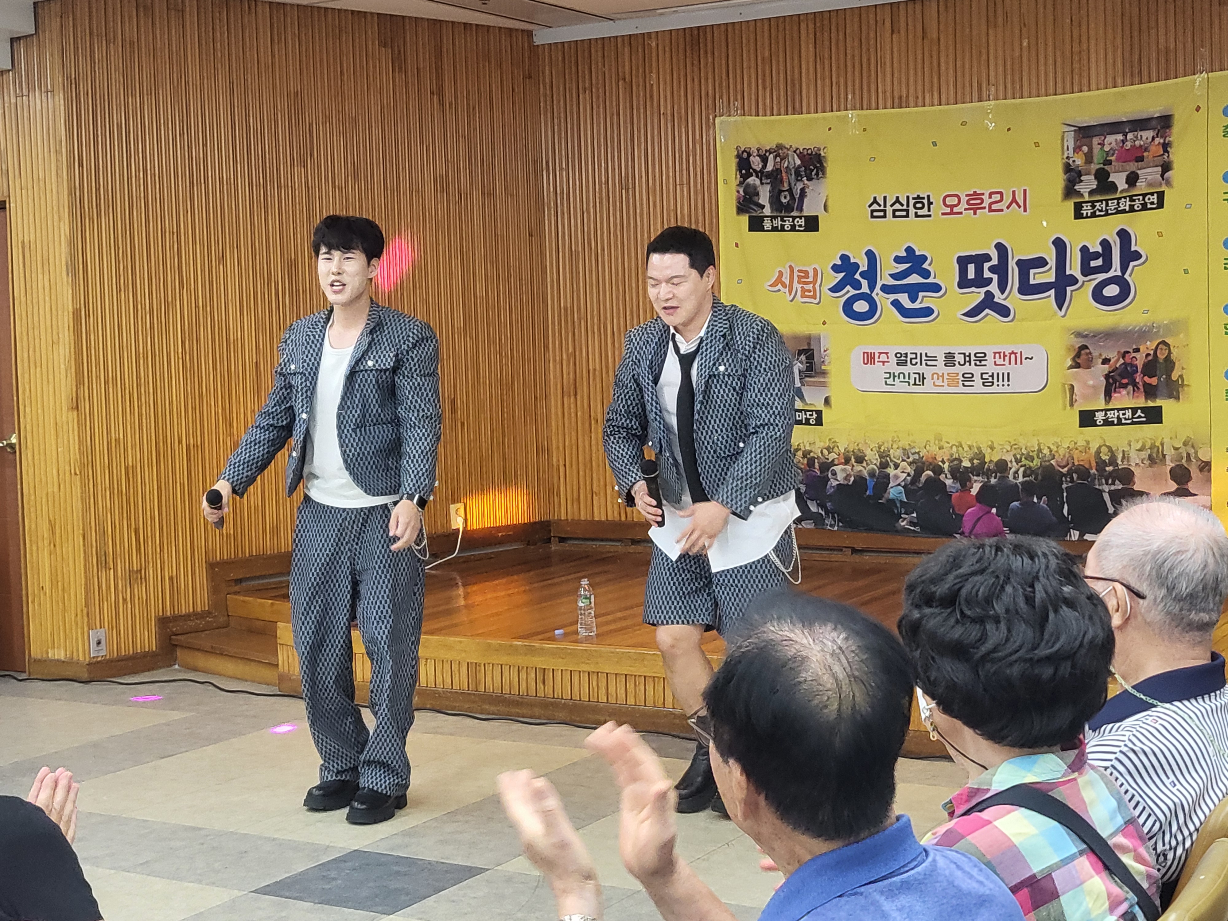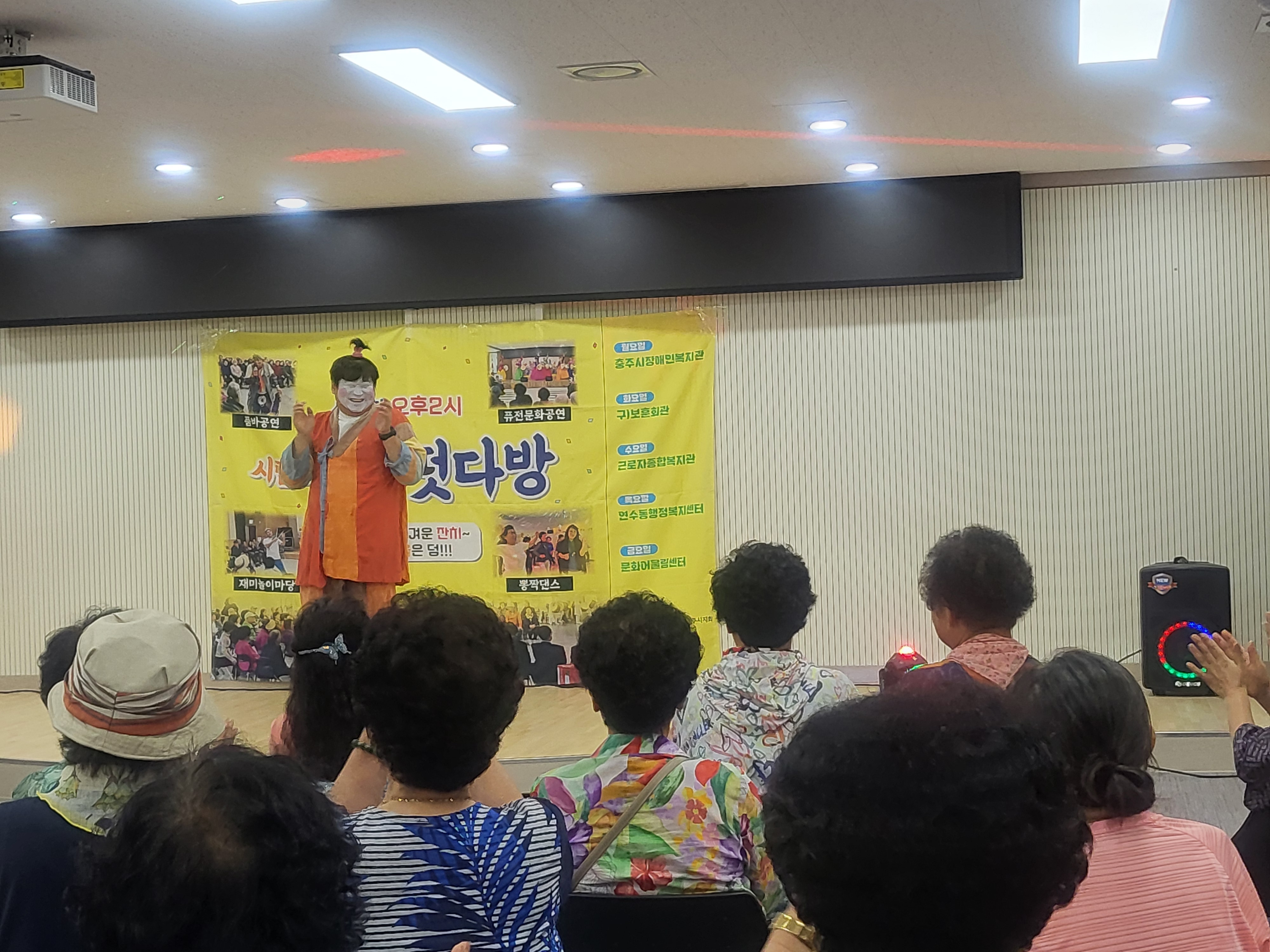 9월 공연 두번째 주는 임형규와 전철근 가수의 공연이 월,화,금요일에 신명나는 트로트와 장구 공연으로 진행되었고, 수,목요일은 삑삑이의 재미있는 마임 공연과 전철근 가수의 공연으로 어르신들이 즐거운 시간을 가졌습니다.