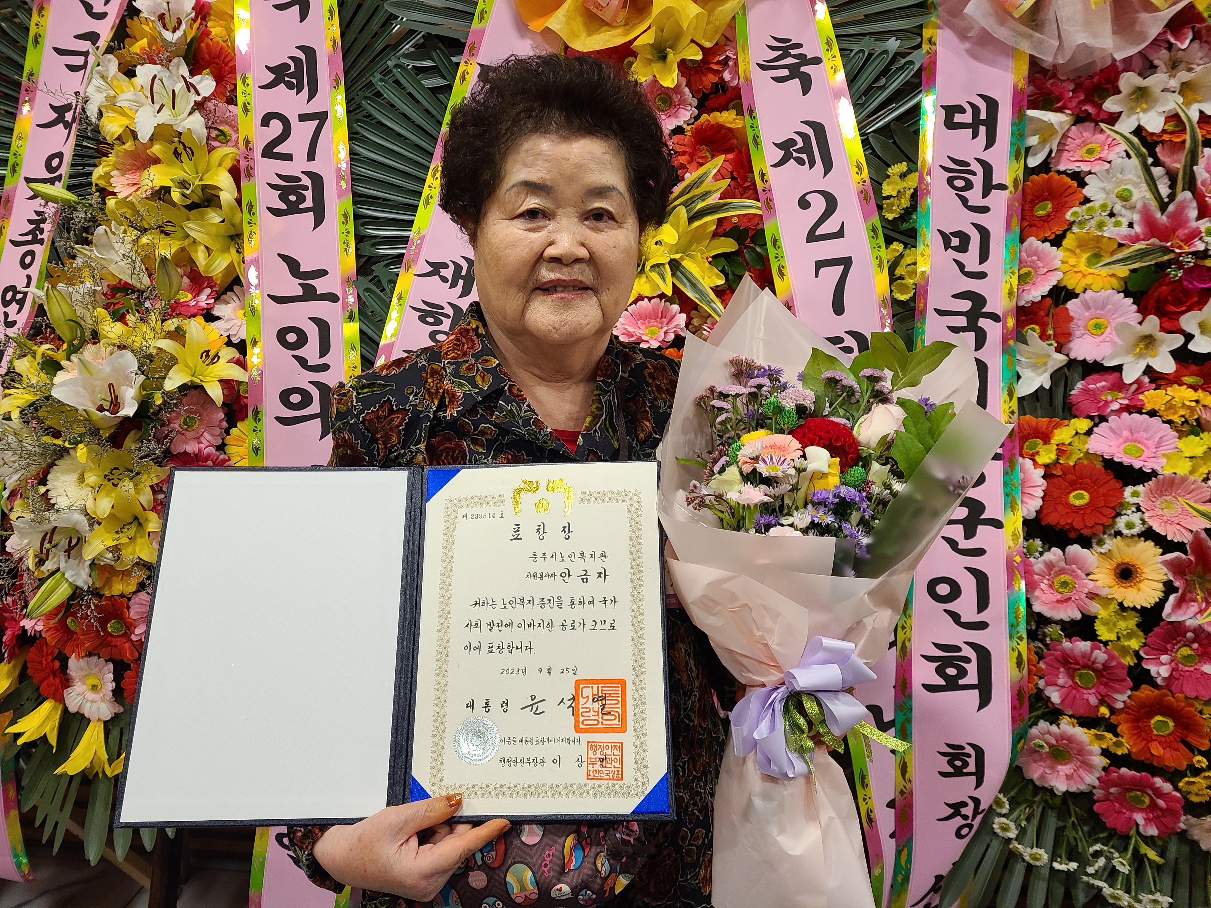 2023년 9월 25일 제27회 노인의날 기념식이 서울 중구 대한상공회의소 국제회의장에서 개최됐습니다. 이 행사에서 충주시노인복지관 안금자 자원봉사자가 노인복지 증진 공로를 인정받아 대통령표창을 수상하셨습니다. 안금자 자원봉사자는 2006년부터 17년(3,000시간)을 한결같은 모습으로 노인복지관 경로식당에서 봉사활동을 하고 계시며 현재까지도 활발하고 적극적인 봉사활동을 통해 지역사회의 모범적인 어르신의 모습을 보여주고 계십니다. 봉사활동을 계속할 수 있다는 것만으로도 너무 감사하고 건강이 허락하는 한 앞으로도 지금처럼 봉사하고 싶다고 말씀하시는 안금자 봉사자님께 진심어린 감사와 축하의 말씀을 드립니다.