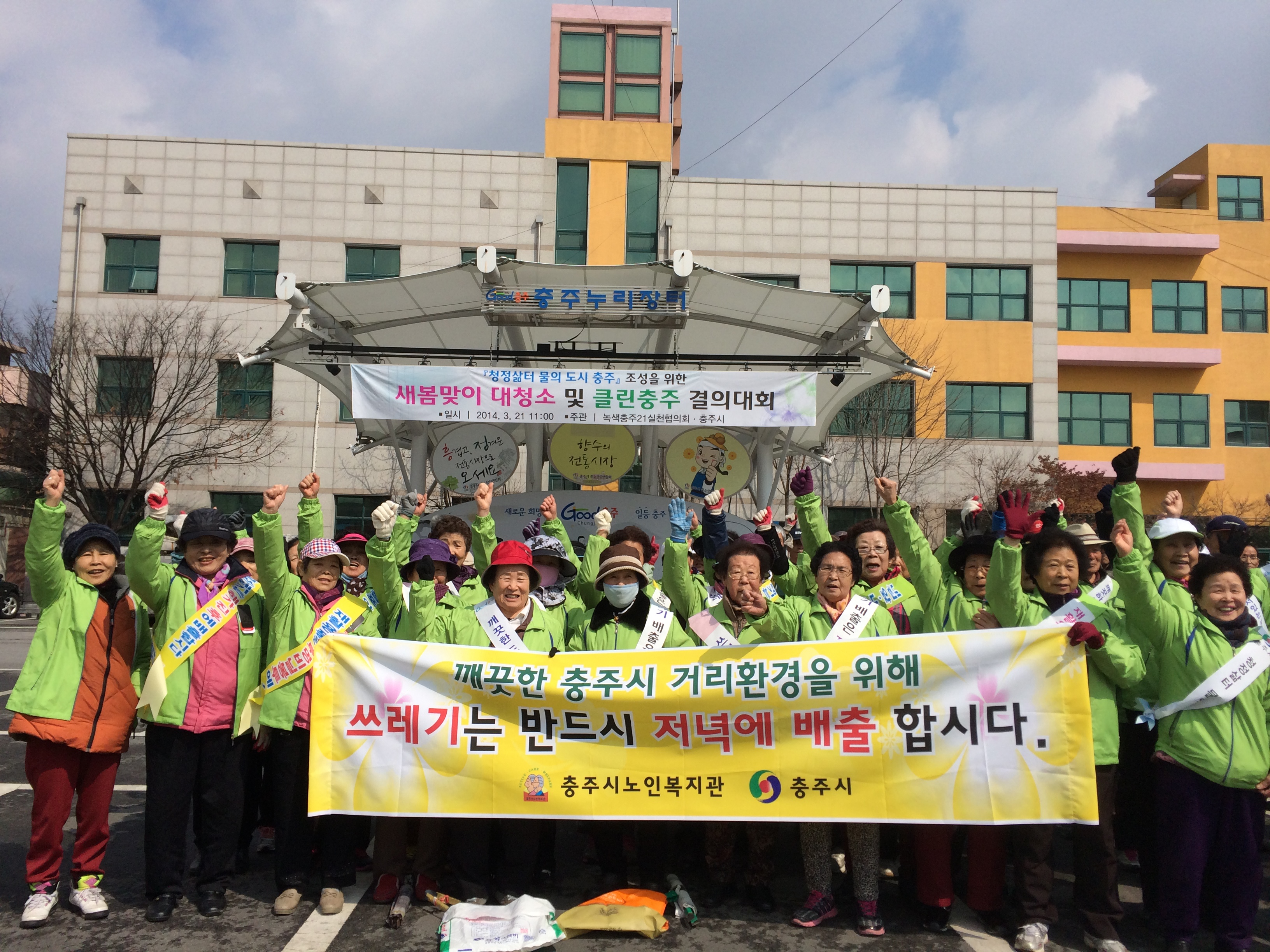 3월 21일 노인일자리사업단 은빛환경지킴이는 21일 충주시와 녹색충주21실천협의회에서 개최하는 새 봄맞이 대청소 및 클린충주 결의대회에 참가했습니다. 결의대회 참가 후 생활환경개선 홍보지를 주변상가에 배포하여 캠페인 활동을 펼쳤습니다.