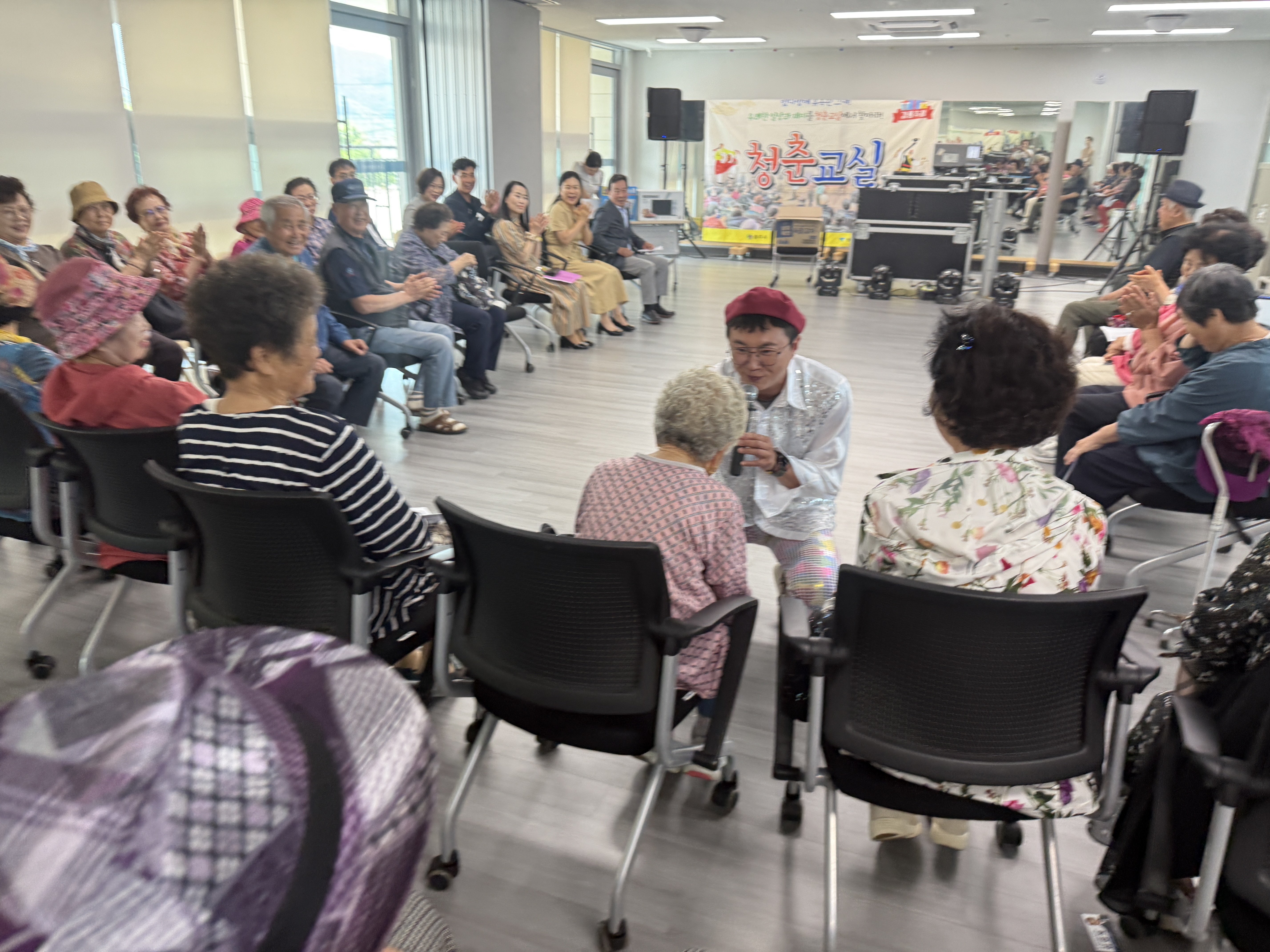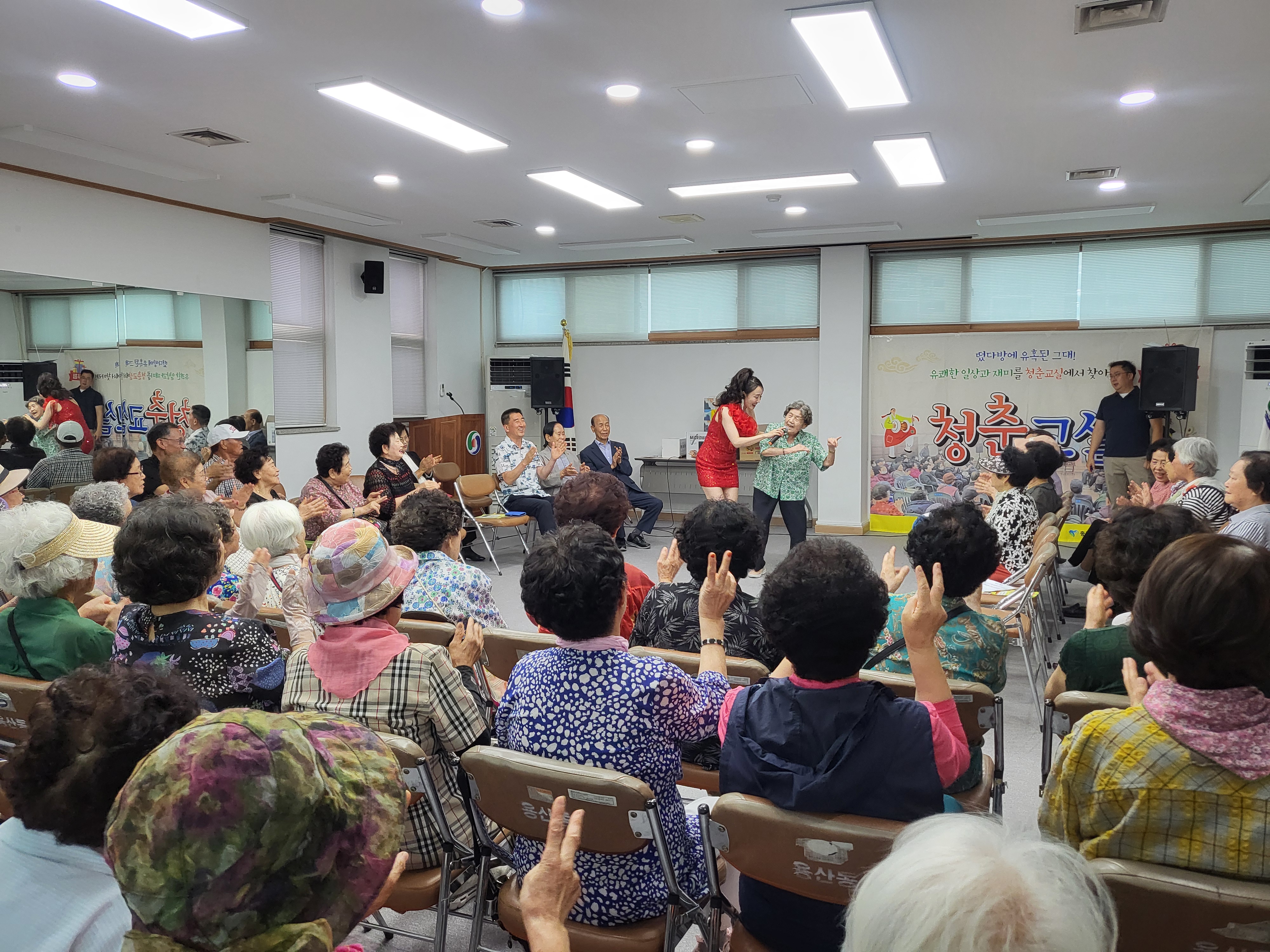 MC박하늘의 뽕짝댄스로 현장에는 41명의 어르신들이 참석하여 즐거운 댄스 시간을 가졌습니다.