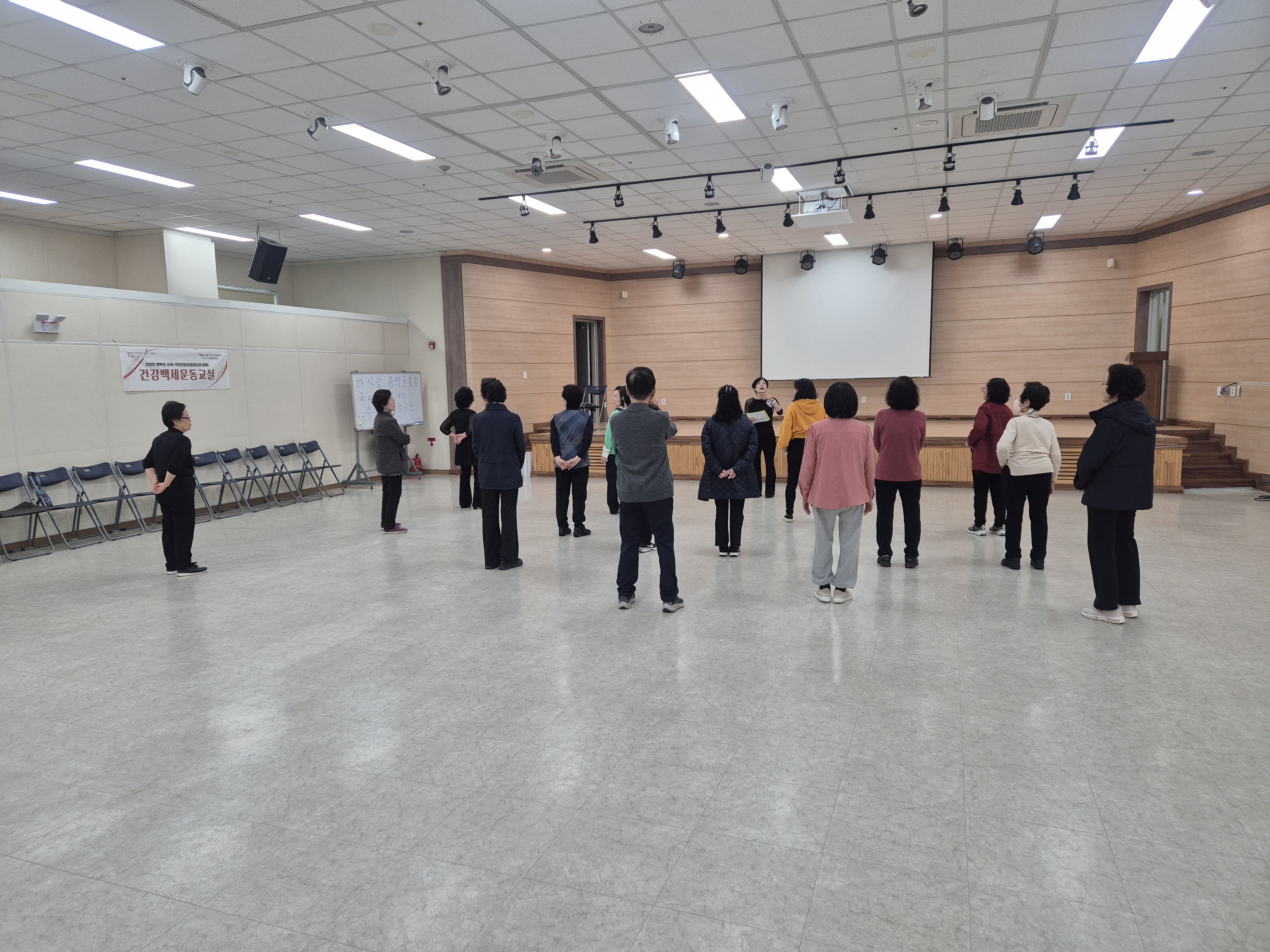 "건강백세운동교실"은 건강보험공단 연계로 진행되는 프로그램으로 어르신을 대상으로 적절한 운동과 건강교육을 실시하여 신체기능 향상 및 건강생활 유지·개선을 도모하고자 만든 프로그램입니다.