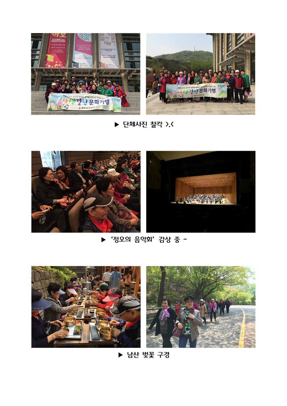 충북사회복지공동모금회 지원 사별노인의 정서적 안정감 실현을 위한 음악치유프로그램인 '사생결단' 의1기 어르신들을 모시고 서울 국립극장에 '정오의 음악회'를 보고 남산 벚꽃 구경을 하기 위해 문화기행을 떠났습니다.