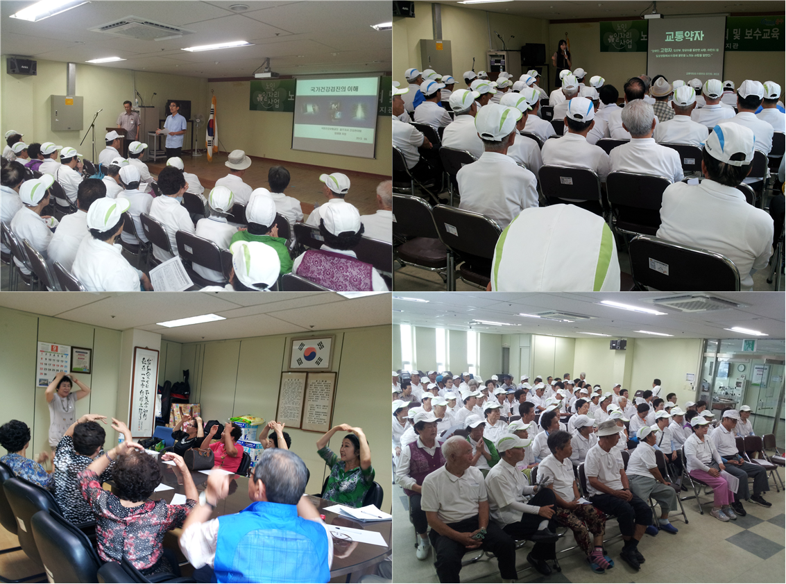 이번 보수교육은 야외 활동으로 교통사고에 노출되어 있는 고령의 참여자들의 안전을 위해 도로교통공단에서 “어르신 교통안전교육”을, 참여자들이 스스로 건강을 챙길 수 있도록 건강보험공단 충주지사에서 “국가 건강검진”에 관한 교육을 진행하여 어르신들로부터 큰 호응을 얻었다. 그리고 경로당예술강사파견사업에서는 우리 복지관에서 오랫동안 자원봉사를 해주고 있는 조난자 강사님으로부터 웃음치료를 배움으로써 참여자들이 전문가로서 자질을 한층 키울 수 있었다.