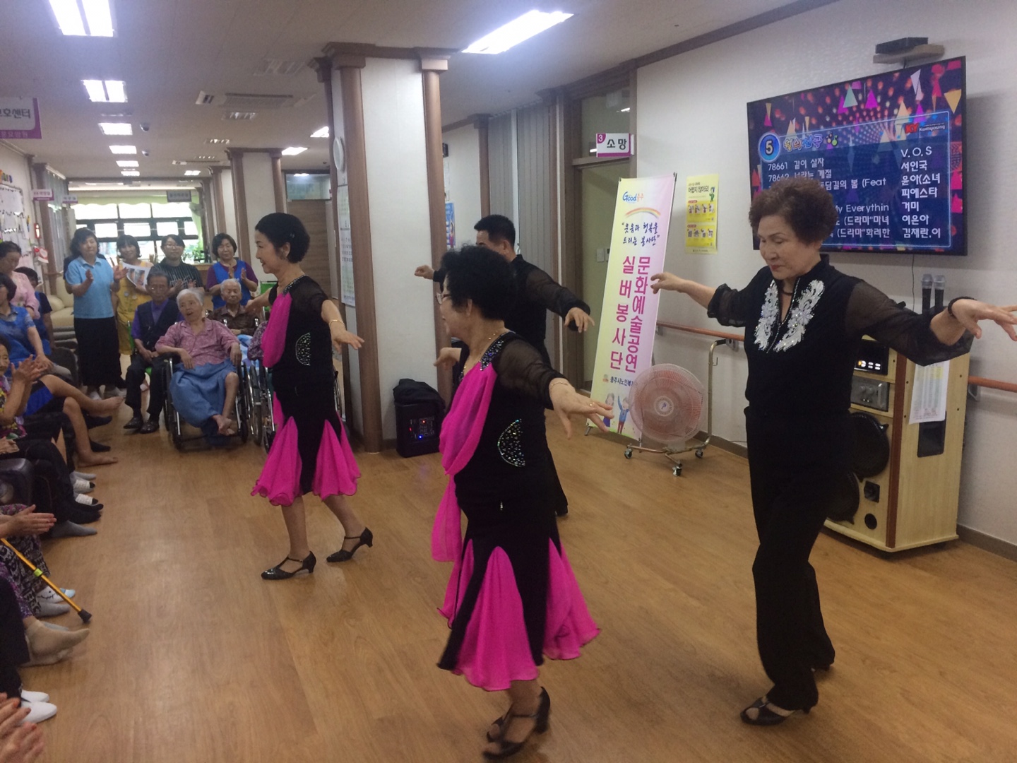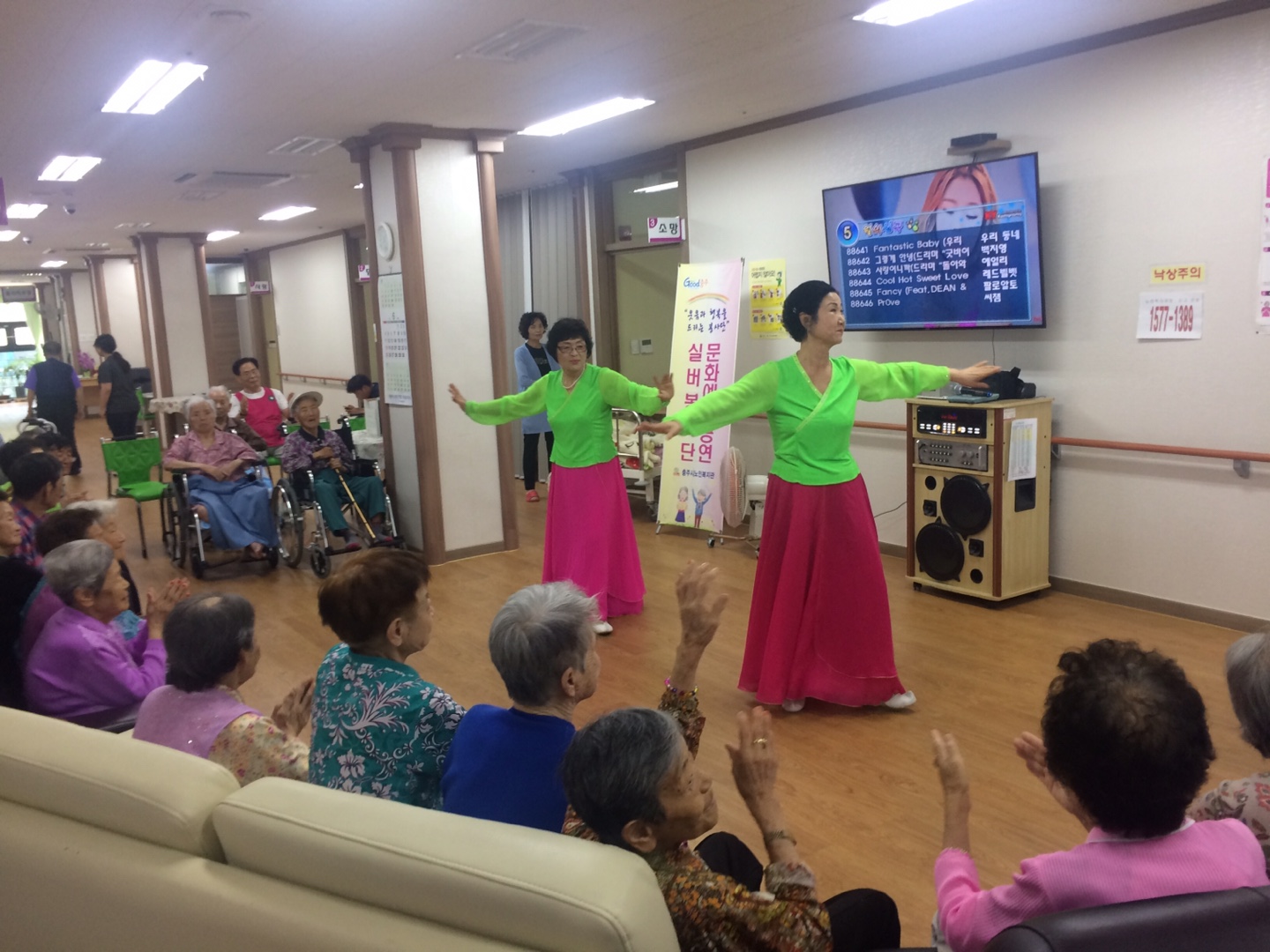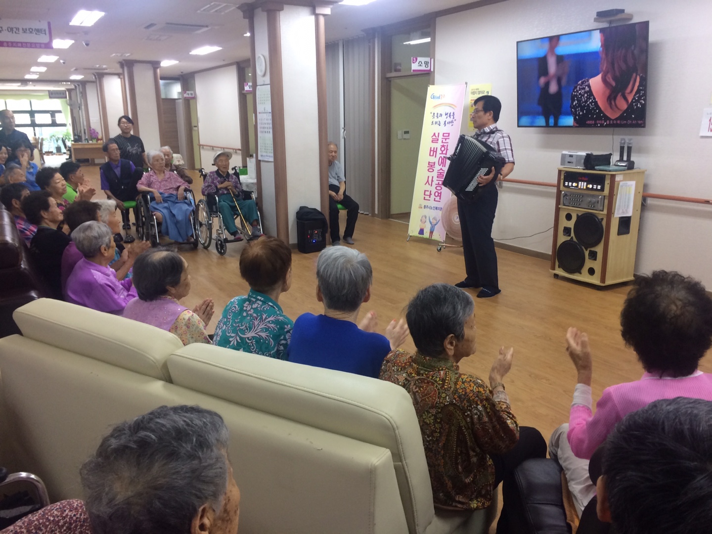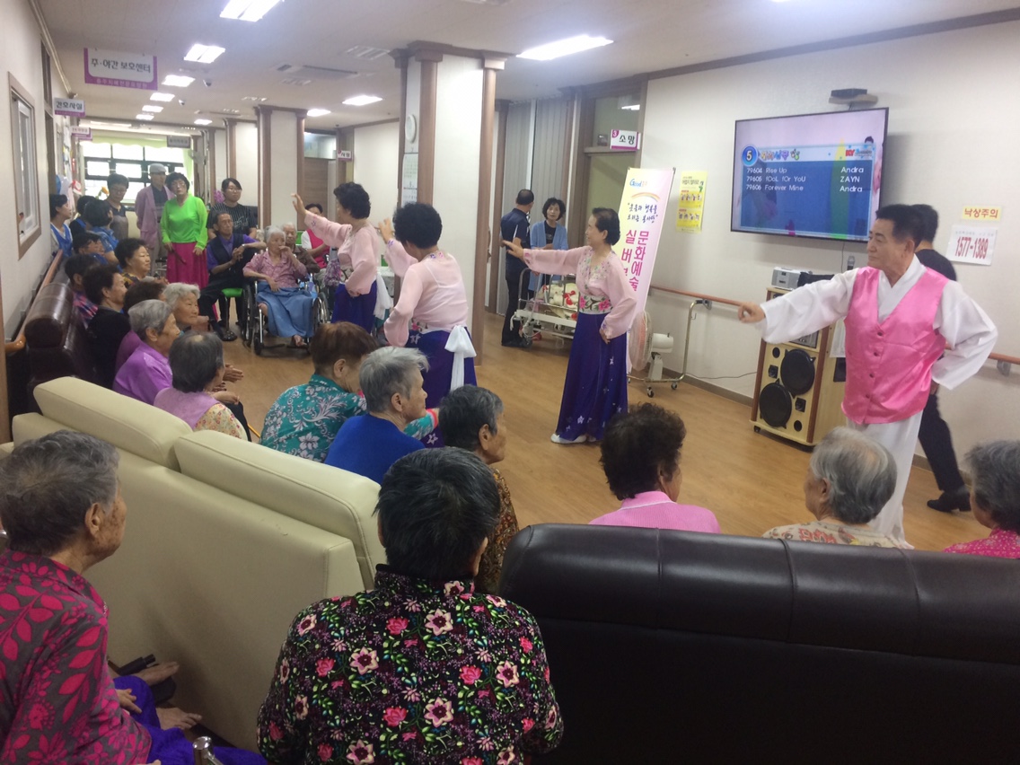 2017년 6월 29일 충주시노인복지관 문화예술공연팀은 충주치매전문요양원에 방문하여 그동안 복지관에서 갈고 닦은 공연 실력을 뽐내는 시간을 가졌습니다. 자원봉사자와 요양원 어르신이 하나되어 즐겁고 보람 있는 시간을 만들었습니다. 협조해주신 충주치매전문요양원 어르신 및 관계자 분들과 문화예술공연 봉사자님들에게 감사합니다.