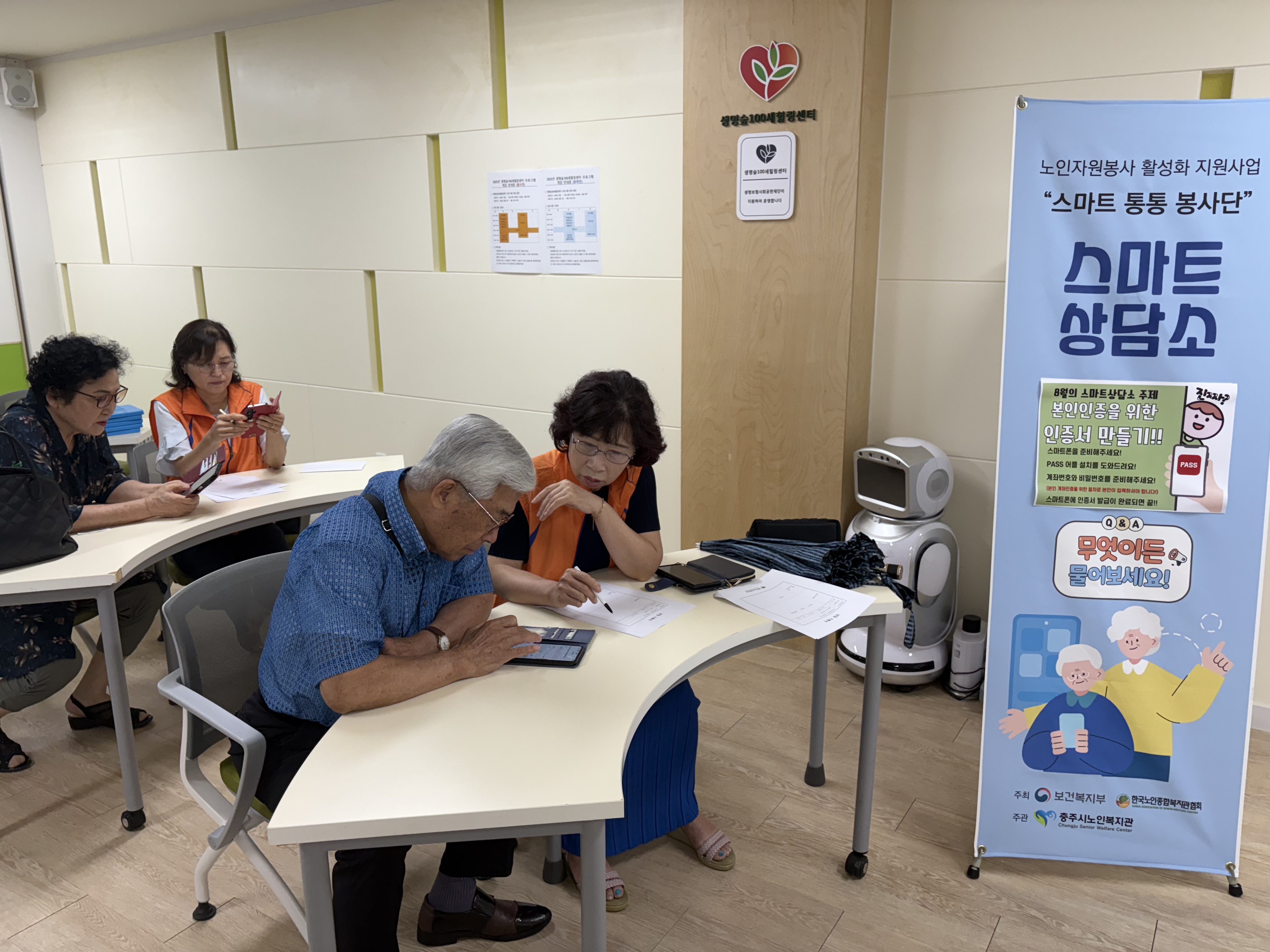 8월 스마트상담소 주제는 '본인인증을 위한 인증서 만들기'로 PASS 어플을 통해 어르신 핸드폰에 인증서를 발급해드릴 수 있었습니다. 또한 PASS 어플에 모바일신분증도 등록해드리며 일상생활 편의 증진과 더불어 다양한 온라인 서비스 이용에 도움을 드릴 수 있었습니다~!