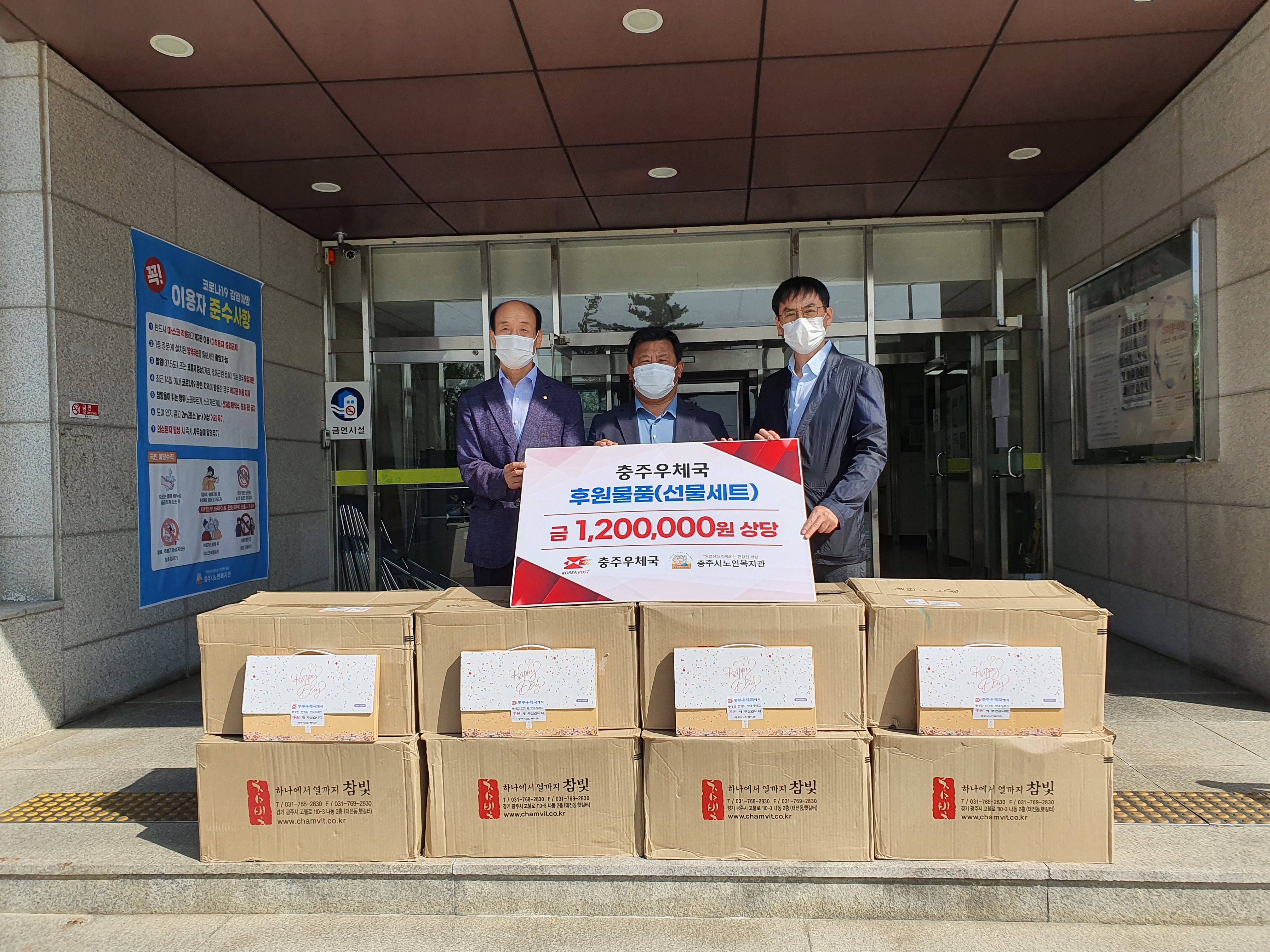 충주우체국(국장 오달규)은 지난 9월13일(월) 취약계층 어르신을 돕기 위해 선물세트(120만원 상당) 200개를 충주시노인복지관(관장 김웅)에 전달하였습니다.