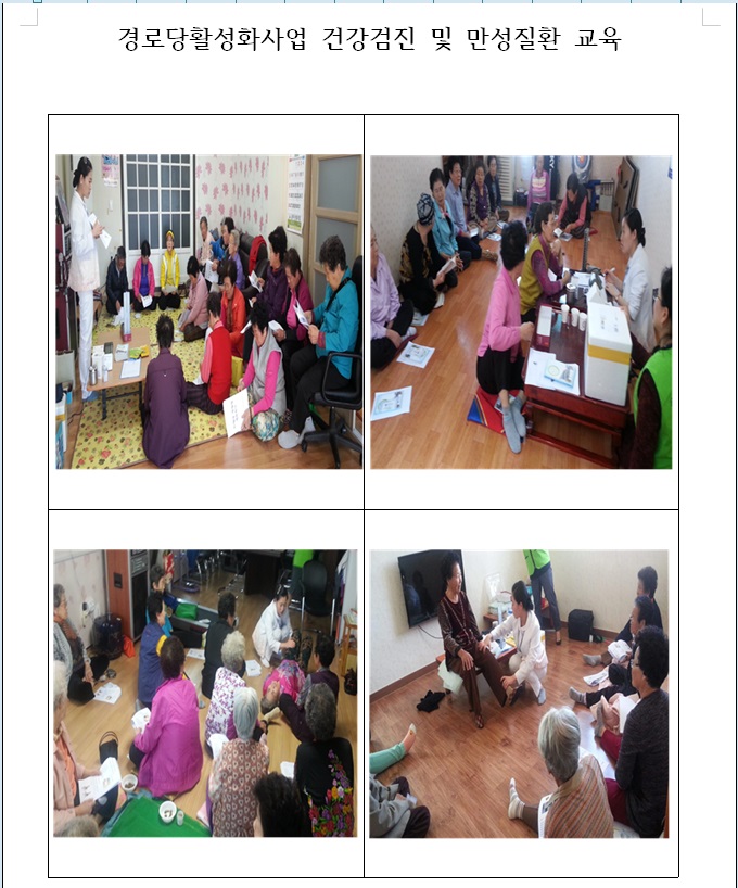 10월6일~10월 16일 충주의료원에서 9개소 경로당어르신들께 혈압, 혈당, 콜레스테롤 검사 및 만성질환, 백내장, 녹내장, 퇴행성 관절염 교육을 실시하였으며, 운동방법및 차후 발생할수 있는 질환에 대해 사전 예방교육도 실시하였습니다. 노인성 질환 및 만성질환에 대한 지식을 습득하고 무료검진을 통해 건강을 지킬수 있는 기회가 되었습니다