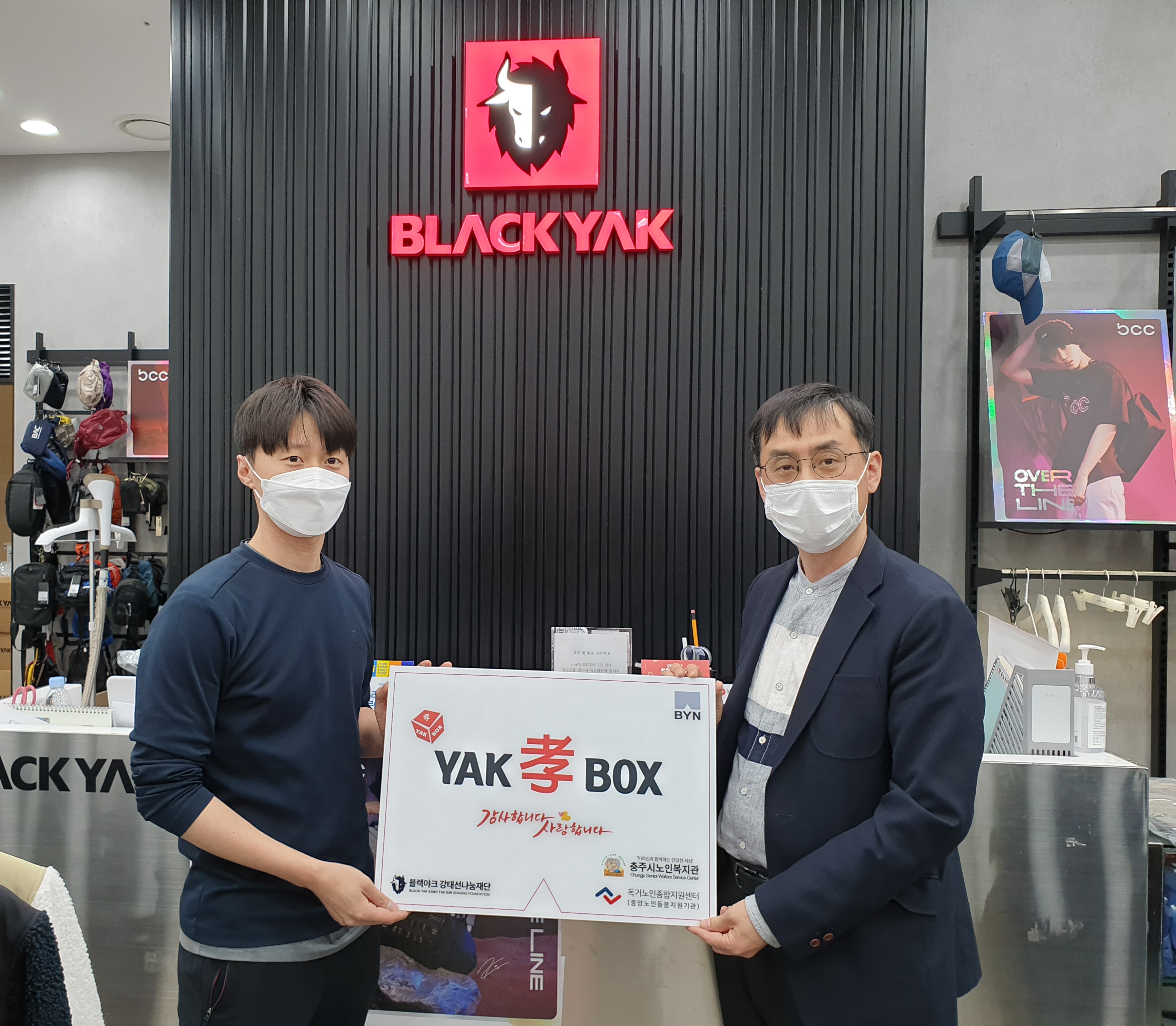 지난 5월 4일에 블랙야크 충주모다점에서 어버이날 기념 어르신에게 블랙야크 워머, 쿨토시, 김, 국수, 미역, 꽃소금, 황도, 젤리, 장바구니 등