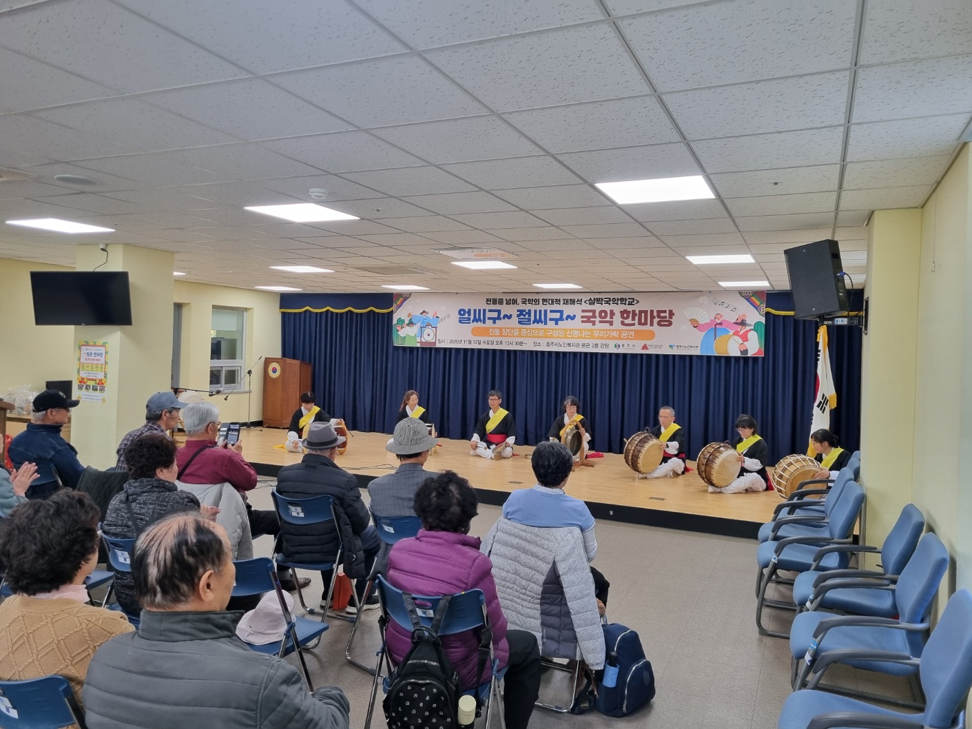 11월 12일(수) 충주시노인복지관 본관에서 충주문화관광재단 지원 '소소한 호강 살짝국악학교' 프로그램의 일환으로 국악 공연 "얼씨구~절씨구~ 국악한마당"을 진행하였습니다.