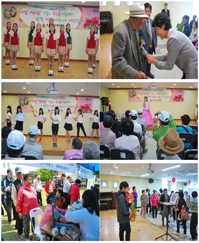 이번 효잔치는 외부 지역사회 단체 연계를 통해 축하공연을 함으로 다양한 볼거리를 제공해 드렸습니다. 또한 충주의료원, 국민건강보험공단 충주지사를 통해 어르신들 건강기초검진을 해 드렸고 충주시 사랑실은 교통봉사대의 찬조로 빵과 음료 500개를 지원해 드렸습니다. 성황리에 끝난 이번 행사는 참석한 어르신 모두가 함께 어우러 즐거움을 나누는 시간이 되었습니다.