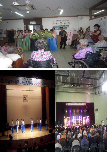 본 복지관 문화예술공연단으로 활동중이신 노인자원봉사자의 활동이 지역사회에 긍정적인 이미지를 제공해 주어 활발한 활동이 이뤄지고 있습니다. 이 노인자원봉사자들은 복지관 프로그램을 통해 습득한 각종 예능을 지역사회에 환원하고자 노인요양시설 및 지역의 다양한 행사에 참여하여 공연을 펼치고 계십니다.