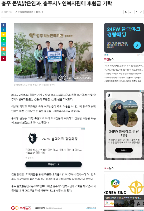 충주 온빛밝은안과, 충주시노인복지관에 후원금 기탁